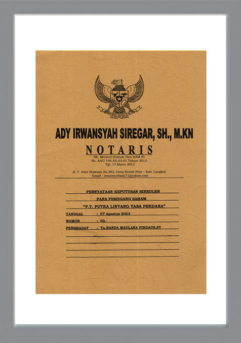 Akta Pendirian Perseroan Terbatas PT Putra Lintang Yasa Perdana Nomor : 03 tanggal 05 Februari 2021, yang mana telah mendapat pengesahan sebagai badan hukum dari Kementerian Hukum dan Hak Asasi Manusia.