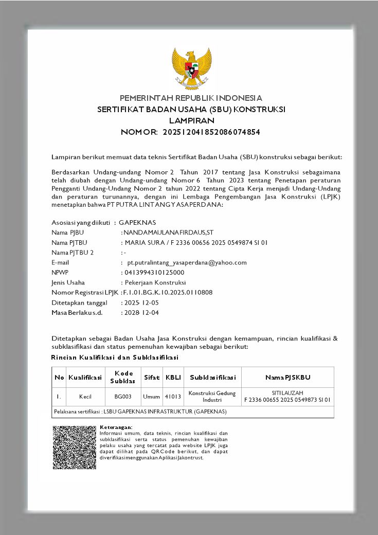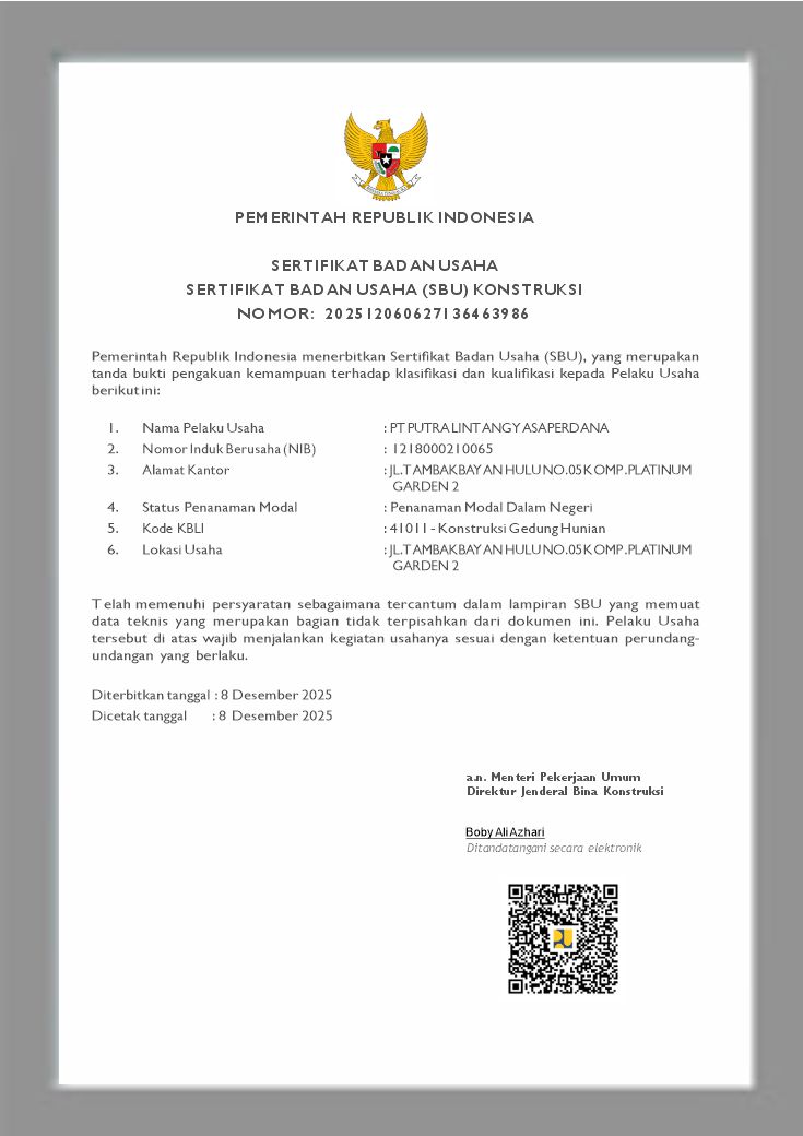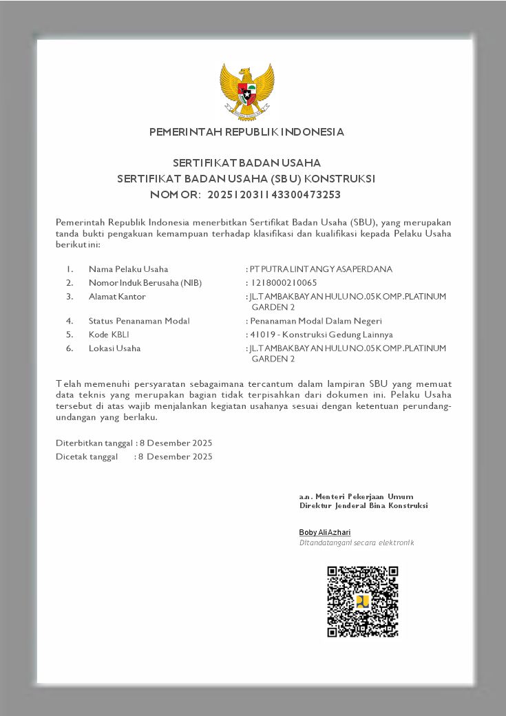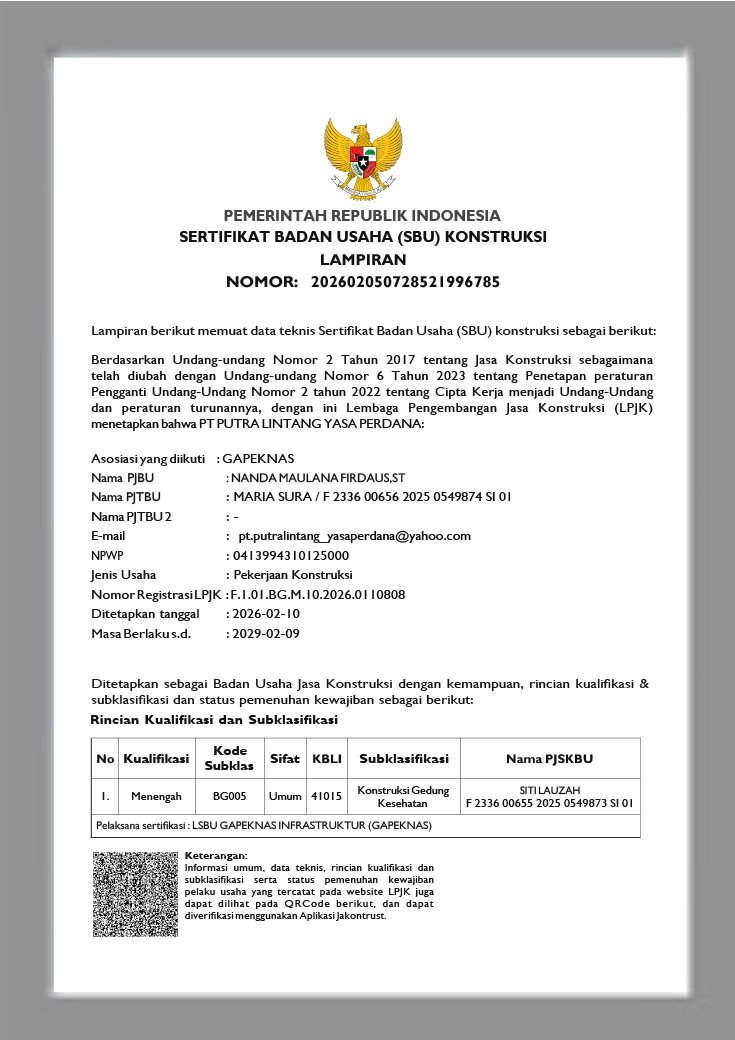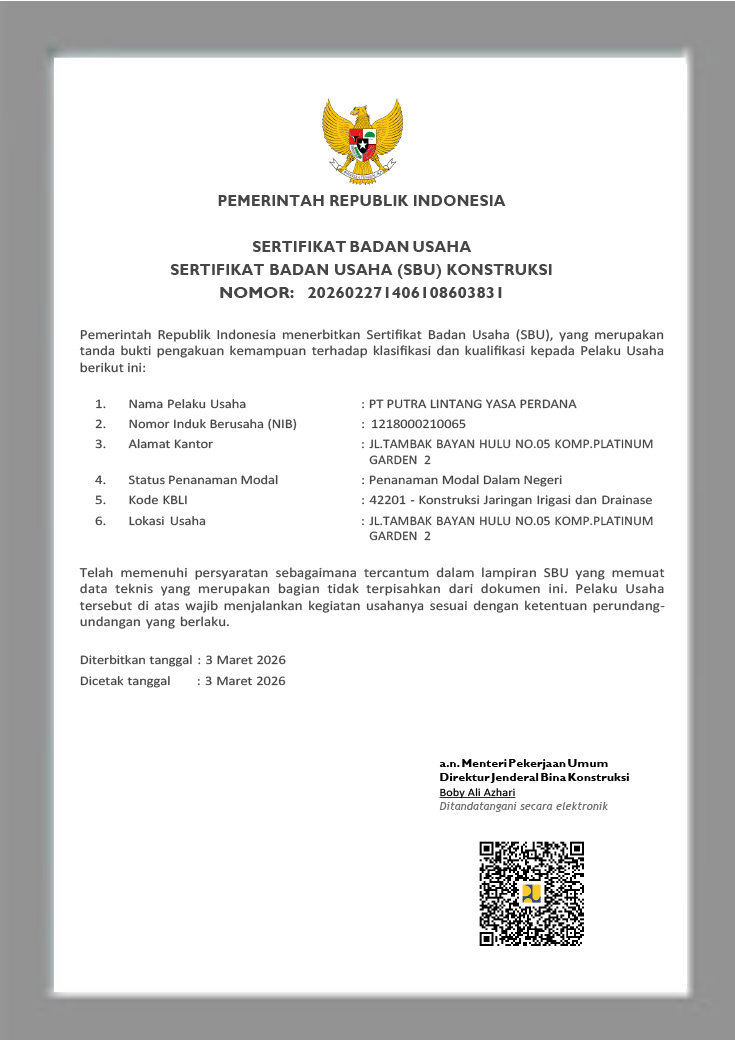 PT. PUTRA LINTANG YASA PERDANA memiliki Sertifikat Badan Usaha (SBU) yang diterbitkan oleh Dinas PUPR - LPJK
