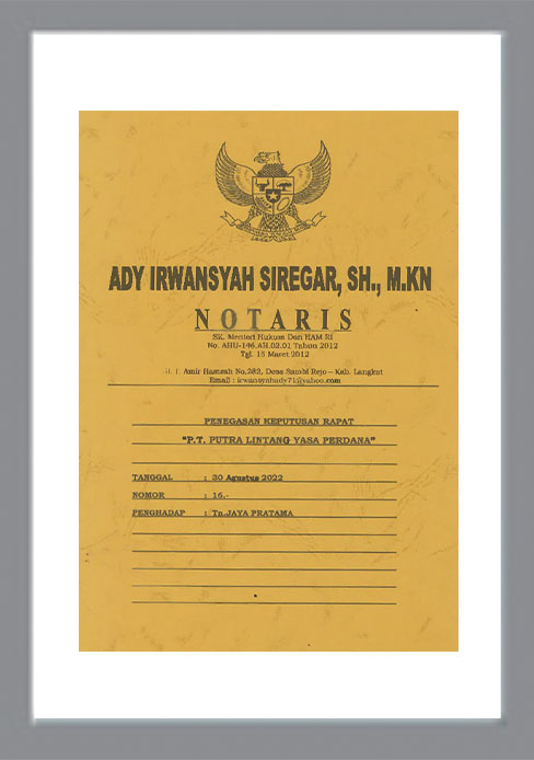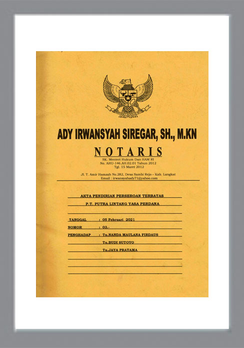 Akta Pendirian Perseroan Terbatas PT Putra Lintang Yasa Perdana Nomor : 03 tanggal 05 Februari 2021, yang mana telah mendapat pengesahan sebagai badan hukum dari Kementerian Hukum dan Hak Asasi Manusia.
