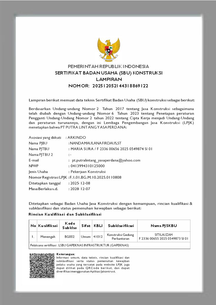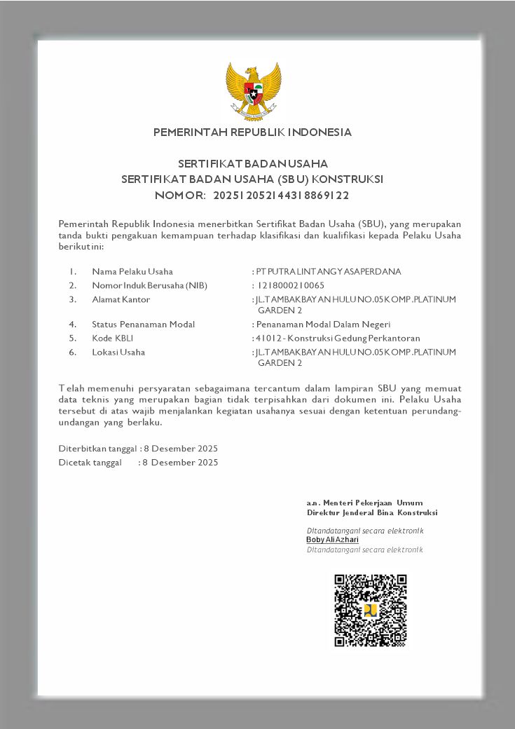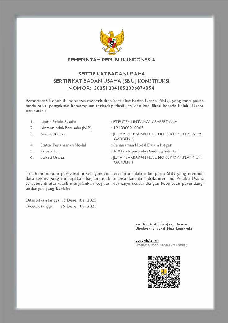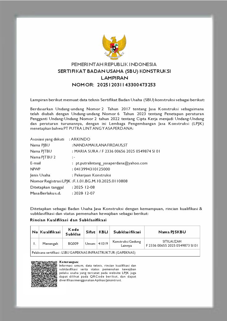 PT. PUTRA LINTANG YASA PERDANA memiliki Sertifikat Badan Usaha (SBU) yang diterbitkan oleh Dinas PUPR - LPJK